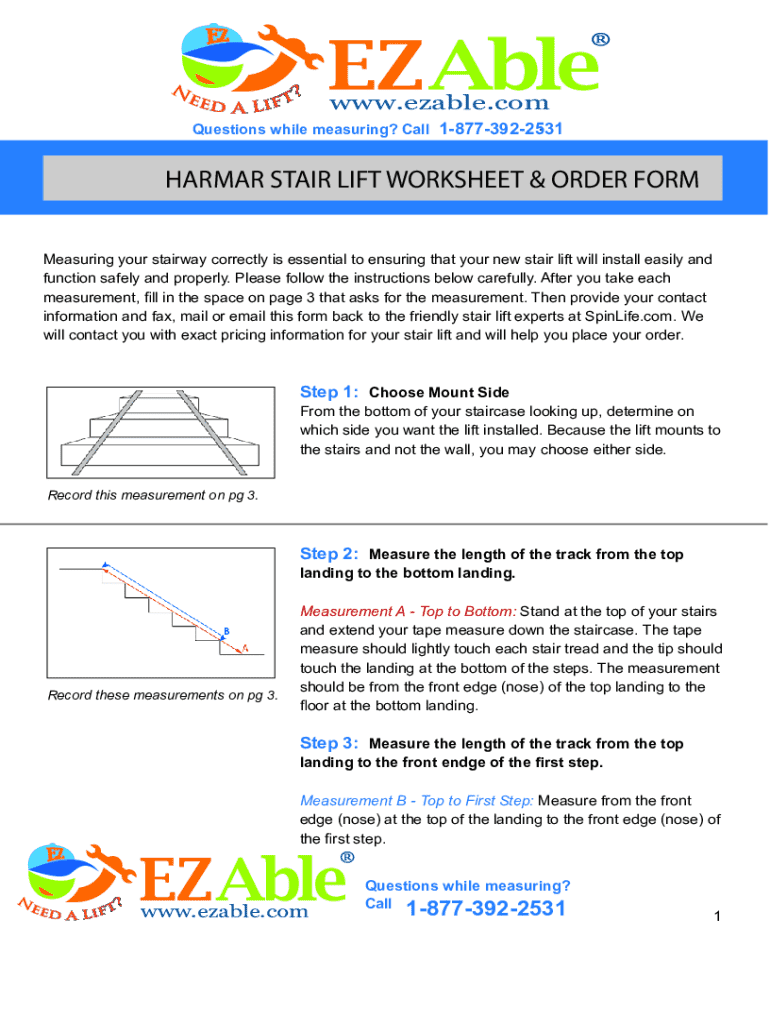 WWW.ezable.com. Questions while measuring? Call 18773922531HARMAR STAIR LIFT WORKSHEET & ORDER FORM Measuring your stairway correctly is essential to ensuring that your new stair lift will install