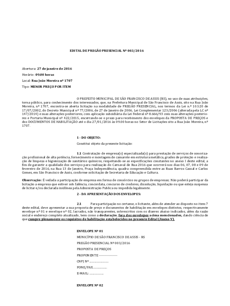 EDITAL DE PREGO PRESENCIAL N 003/2016Abertura: 27 de janeiro de 2016 Horrio: 09.00 horas Local: Rua Joo Moreira n 1707 Tipo: MENOR PREO POR ITEMO PREFEITO MUNICIPAL DE SO FRANCISCO DE ASSIS (RS),
