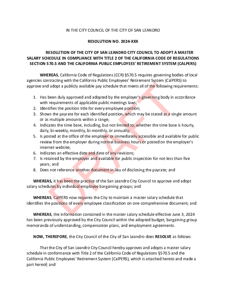 IN THE CITY COUNCIL OF THE CITY OF SAN LEANDRO RESOLUTION NO. 2024XXX RESOLUTION OF THE CITY OF SAN LEANDRO CITY COUNCIL TO ADOPT A MASTER SALARY SCHEDULE IN COMPLIANCE WITH TITLE 2 OF THE CALIFORNIA