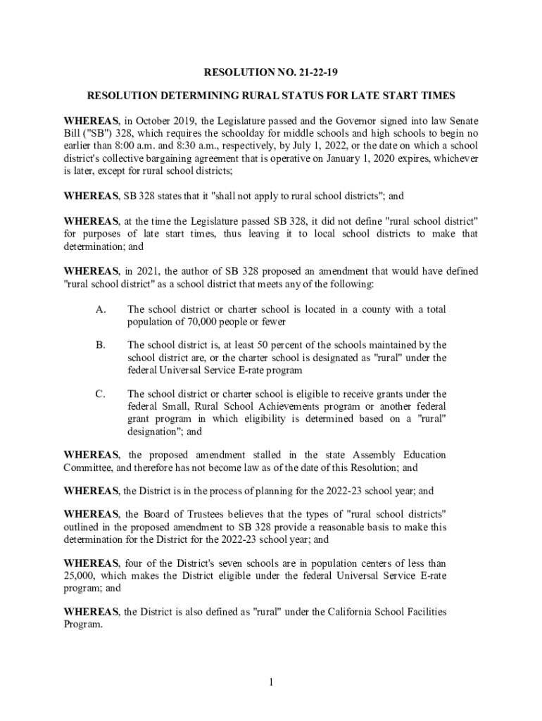 Resolution determining that the District is exempt from the late school start times required by SB 328 for the 2022-23 school year, based on the reasonable basis that it is a \'rural school district\'.