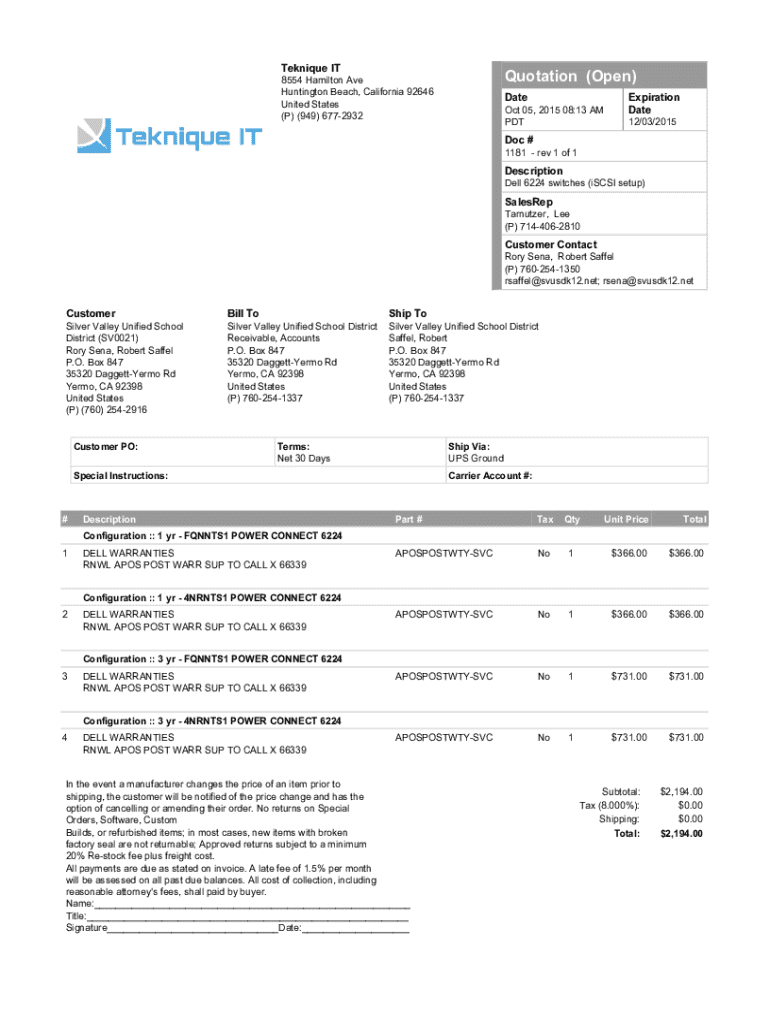 Teknique ITQuotation (Open)8554 Hamilton Ave Huntington Beach, California 92646 United States (P) (949) 6772932Date Oct 05, 2015 08:13 AM PDTExpiration Date 12/03/2015Doc # 1181 rev 1 of 1Description