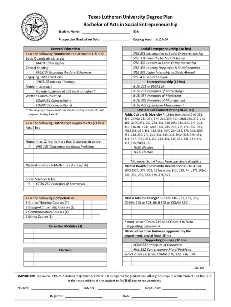 Texas Lutheran University Degree Plan Bachelor of Arts in Social Entrepreneurship Student Name:___ ID#: ___Prospective Graduation Date: ___General EducationTake the following Foundation requirements