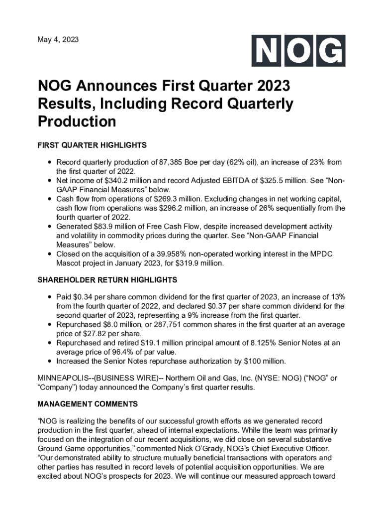 May 4, 2023NOG Announces First Quarter 2023 Results, Including Record Quarterly Production FIRST QUARTER HIGHLIGHTS Record quarterly production of 87,385 Boe per day (62% oil), an increase of 23%