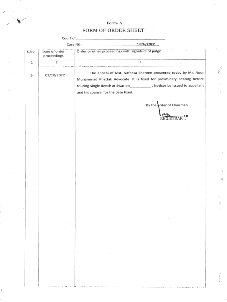 / , \'Form ATFORM OF ORDER SHEET Court of 1426/2022Case N(b.S.No.11Date of order proceedingsOrder or other proceedings with signature of judge3203/10/2022The appeal of Mst. Nafeesa Shereen presented
