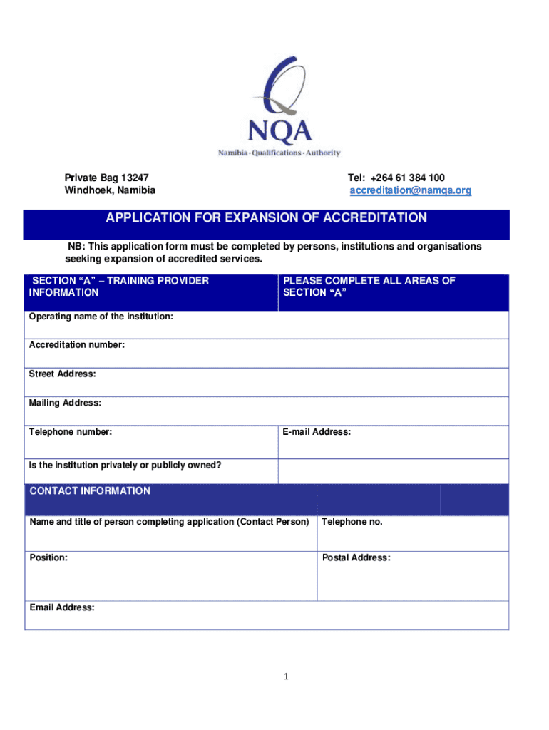 Private Bag 13247 Windhoek, Namibia: +264 61 384 100 accreditation@namqa.orgAPPLICATION FOR EXPANSION OF ACCREDITATION NB: This application form must be completed by persons, institutions and organizations