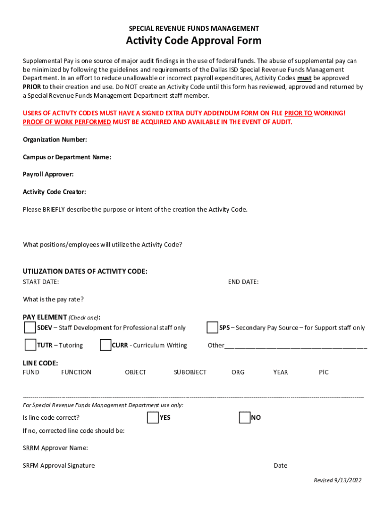 SPECIAL REVENUE FUNDS MANAGEMENTActivity Code Approval Form