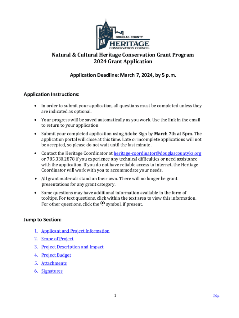 Natural & Cultural Heritage Conservation Grant Program 2024 Grant Application Deadline: March 7, 2024, by 5 p.m. Application Instructions: In order to submit your application, all questions must be