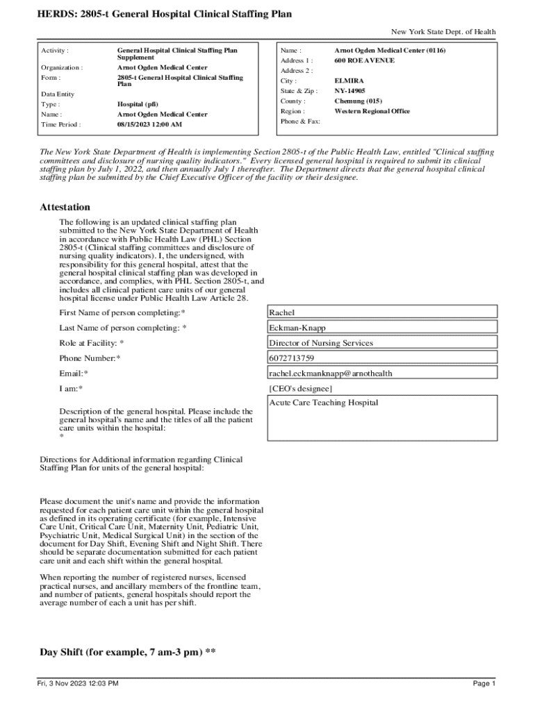 HERDS: 2805t General Hospital Clinical Staffing Plan New York State Dept. of Health Activity : Organization : Form : Data Entity Type : Name : Time Period :General Hospital Clinical Staffing Plan