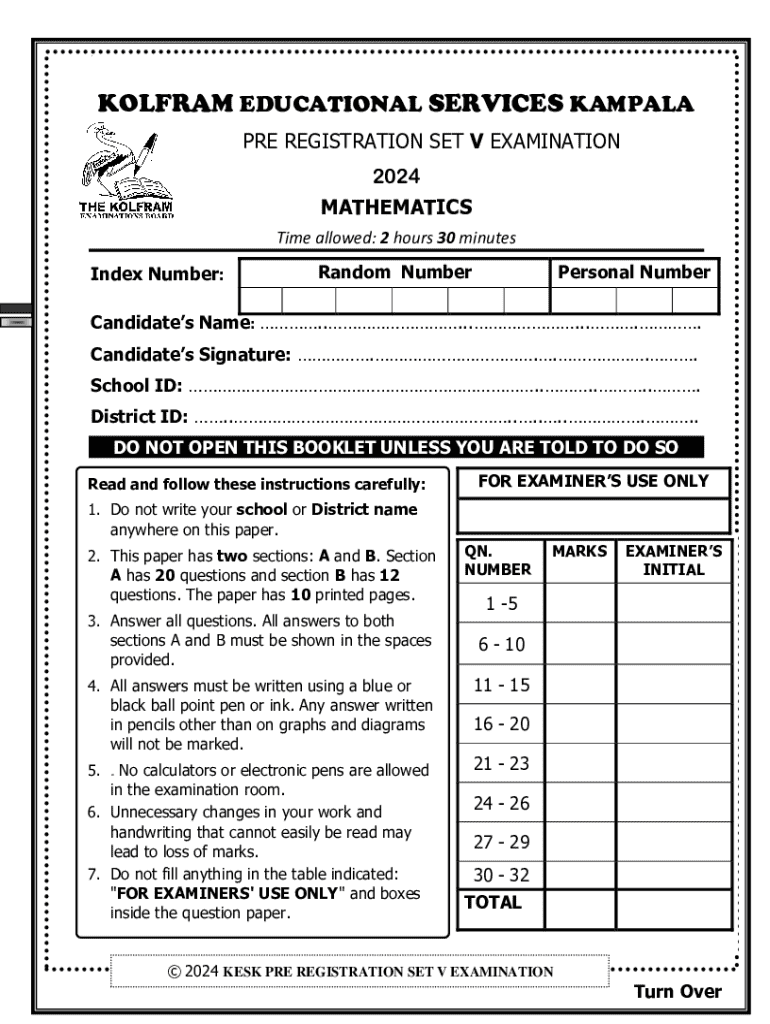 6KOLFRAM EDUCATIONAL SERVICES KAMPALA PRE REGISTRATION SET V EXAMINATION 2024 MATHEMATICS Time allowed: 2 hours 30 minutes Index Number:Random NumberPersonal NumberCandidates Name: .......... Candidates
