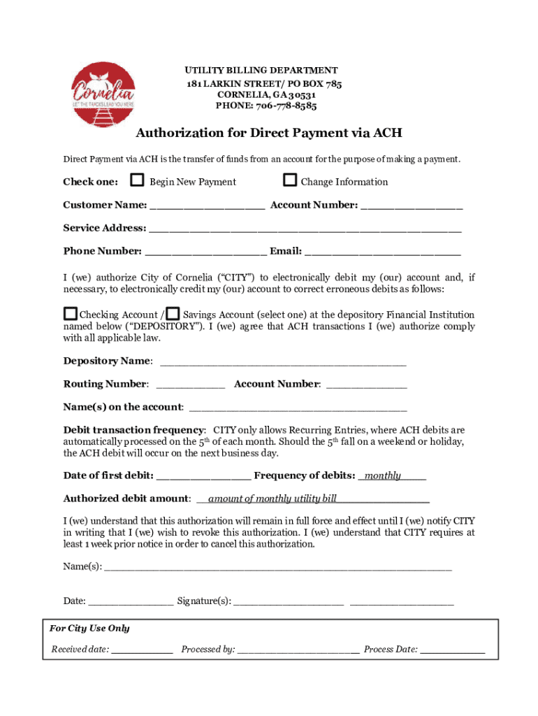 UTILITY BILLING DEPARTMENT 181 LARKIN STREET/ PO BOX 785 CORNELIA, GA 30531 PHONE: 7067788585Authorization for Direct Payment via ACH Direct Payment via ACH is the transfer of funds from an account