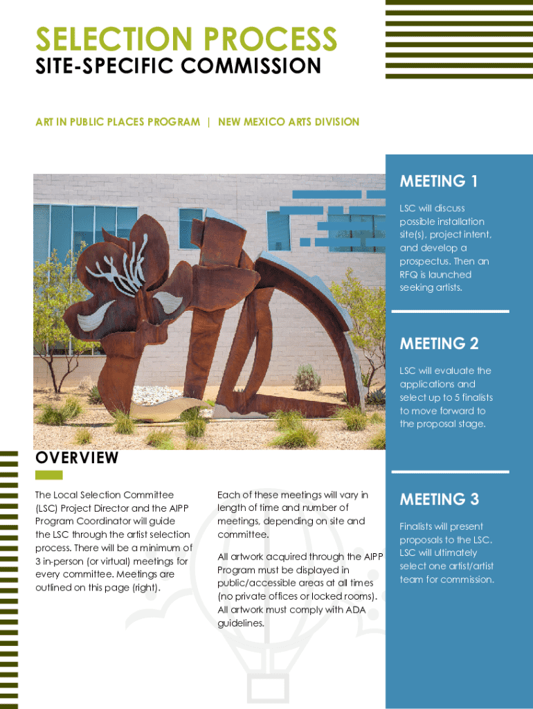 SELECTION PROCESS SITESPECIFIC COMMISSION ART IN PUBLIC PLACES PROGRAM | NEW MEXICO ARTS DIVISIONMEETING 1 LSC will discuss possible installation site(s), project intent, and develop a prospectus.