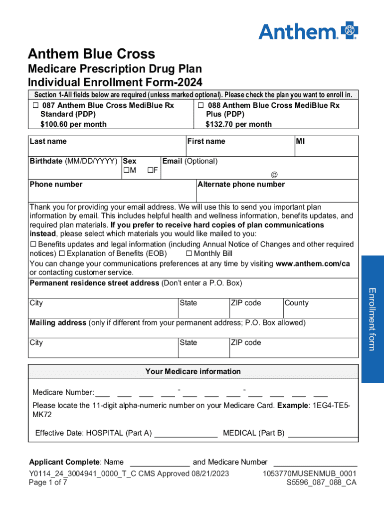 Get the free Anthem Blue Cross and Blue Shield Prescription Drug Plans