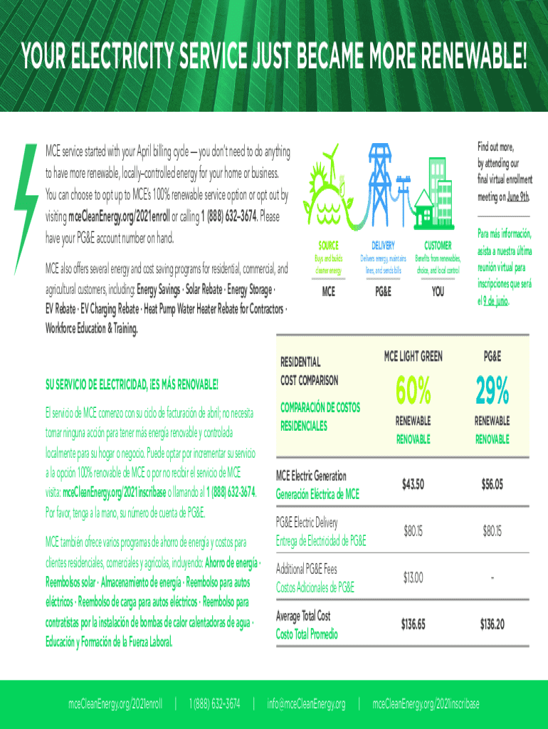 YOUR ELECTRICITY SERVICE JUST BECAME MORE RENEWABLE! HOW MCE WORKSMCE service started with your April billing cycle you dont need to do anything to have more renewable, locallycontrolled energy for
