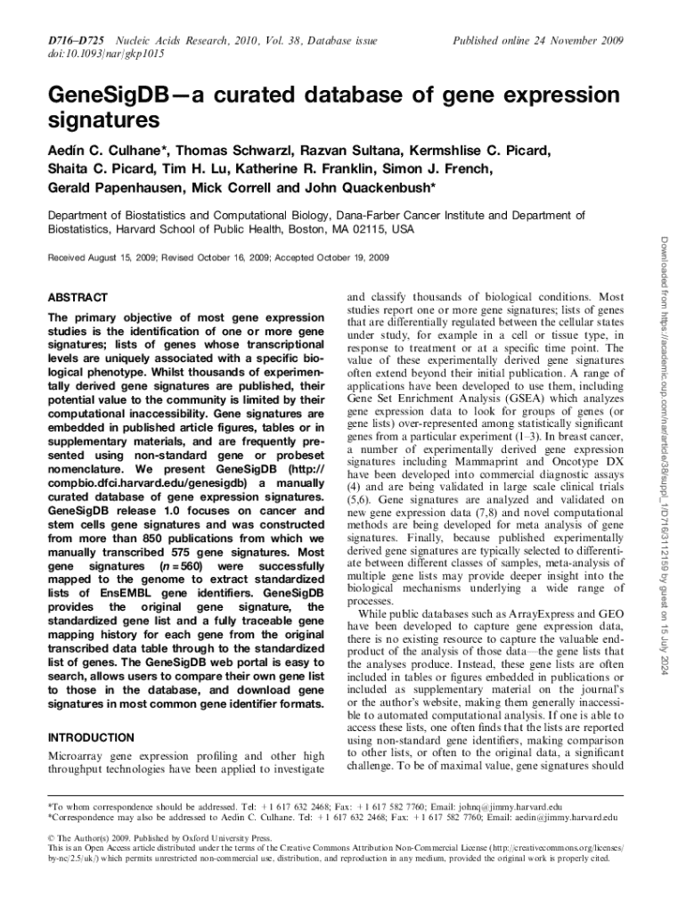 DOI:10.1093/nar/gkp1015Published online 24 November 2009GeneSigDBa curated database of gene expression