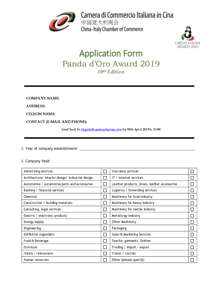 Application Form Panda door Award 2019 10th EditionCOMPANY NAME: ADDRESS: CEO/GM NAME: CONTACT (EMAIL AND PHONE): Send back to sh.gala@cameraitacina.com by 30th April 2019 h. 18:001. Year of company