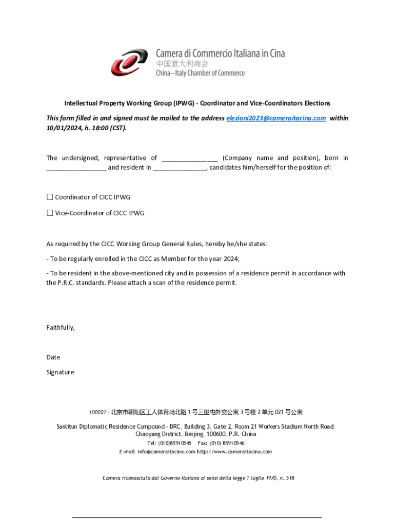 Intellectual Property Working Group (IPWG) Coordinator and ViceCoordinators Elections This form filled in and signed must be mailed to the address elezioni2023@cameraitacina.com within 10/01/2024,