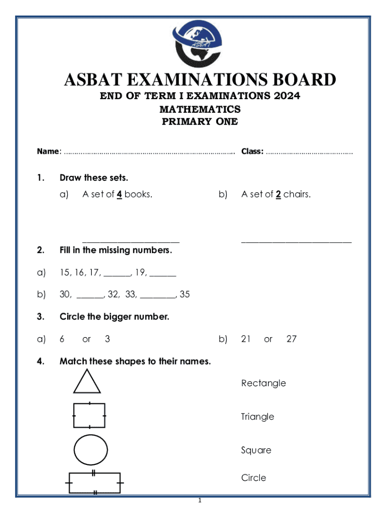 ASB AT EXAMINATIONS BOARD END OF TERM I EXAMINATIONS 2024 MATHEMATICS PRIMARY Rename: . Class: 1. Draw these sets. a)A set of 4 books.b)2.___ Fill in the missing numbers.a)15, 16, 17, ___, 19, ___b)30,