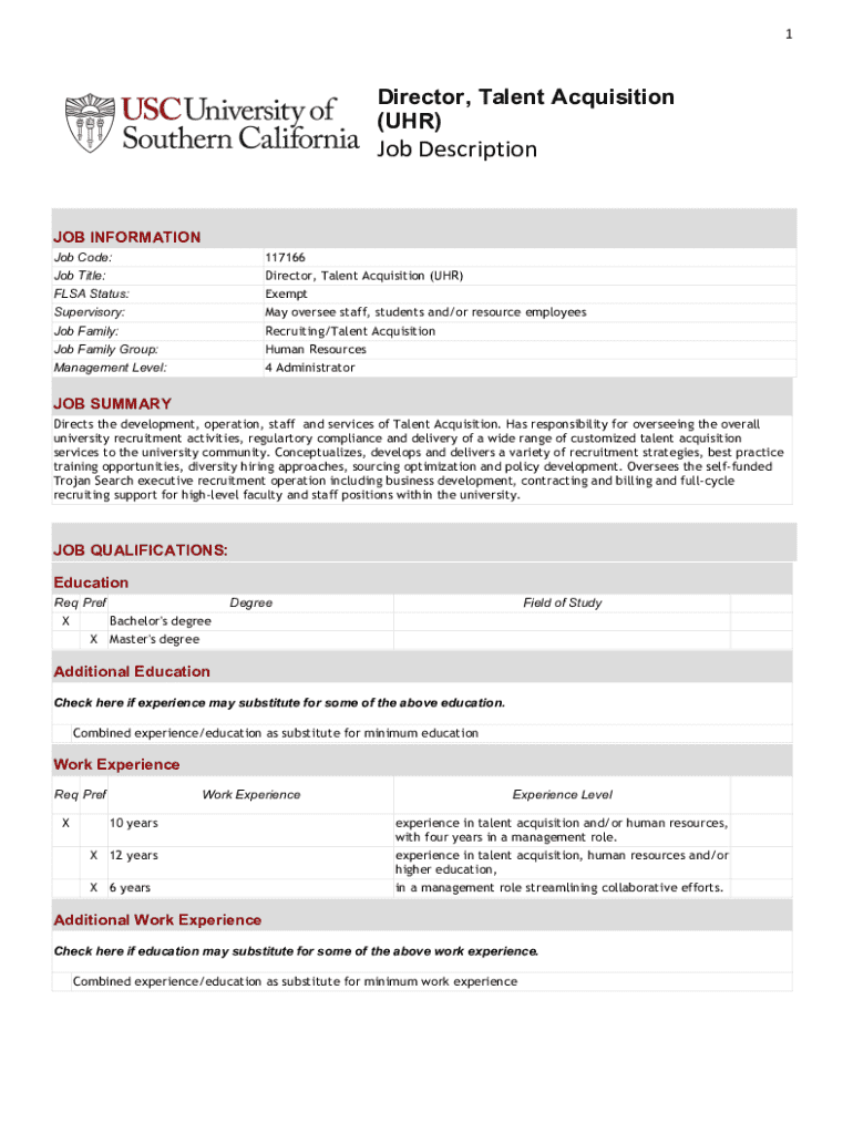 1Director, Talent Acquisition (UHF)Job Description INFORMATION Job Code:117166Job Title:Director, Talent Acquisition (UHF)FLEA Status:ExemptSupervisory:May oversee staff, students and/or resource