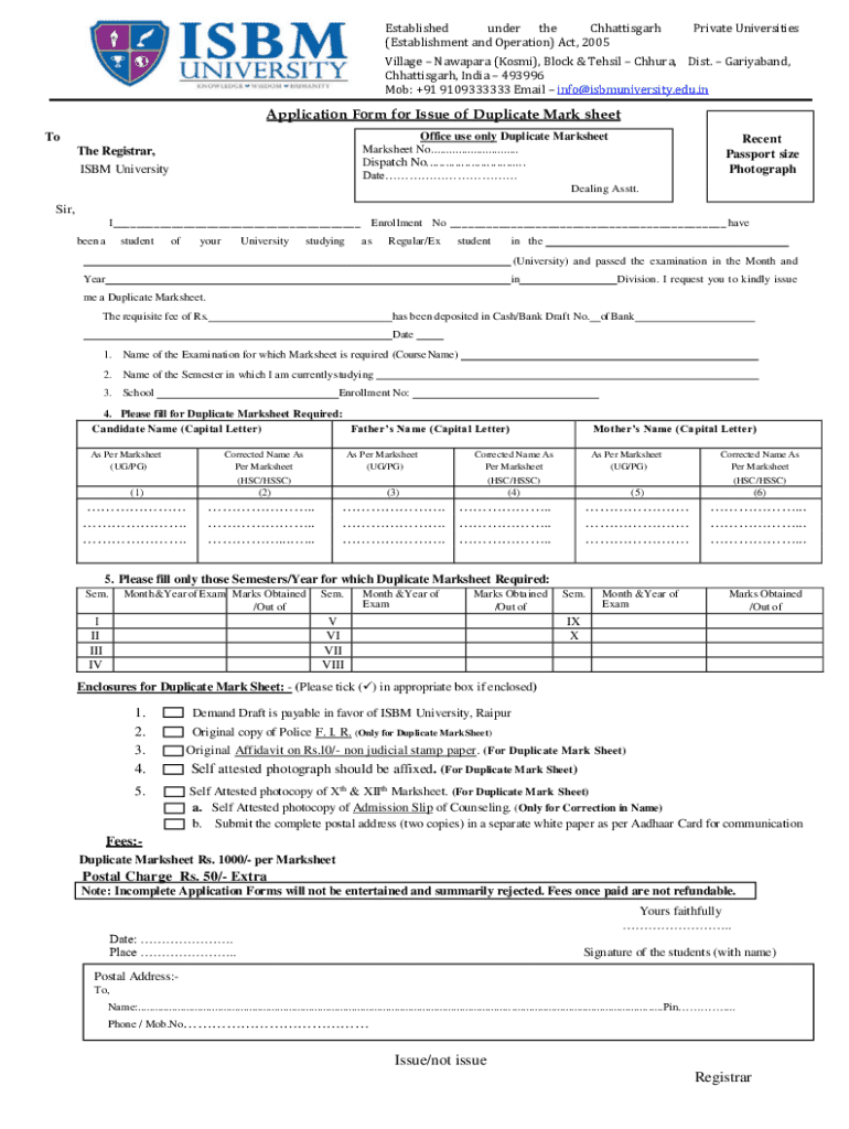 Get the free Application Form for Issue of Duplicate Mark sheet