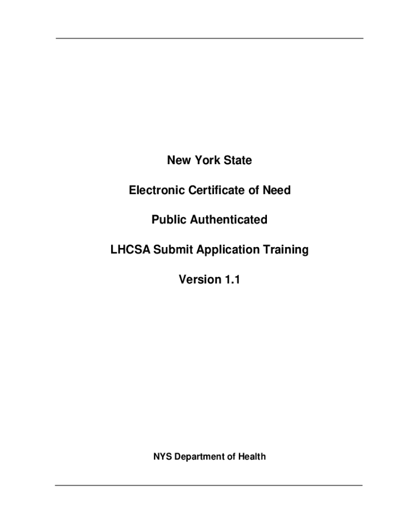 New York State Electronic Certificate of Need Public Authenticated LHCSA Submit Application Training Version 1.1NYS Department of HealthRevision History DateVersion04/20/2015 03/01/20171.0 1.1Description
