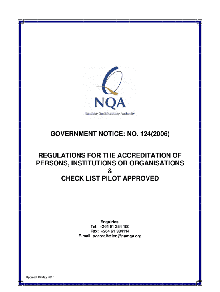 GOVERNMENT NOTICE: NO. 124(2006) REGULATIONS FOR THE ACCREDITATION OF PERSONS, INSTITUTIONS OR Organizations & CHECK LIST PILOT APPROVEDEnquiries: Tel: +264 61 384 100 Fax: +264 61 384114 Email: accreditation@namqa.orgUpdated