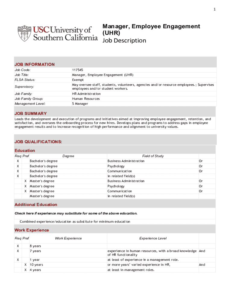 Get the free Manager, Employee Engagement (UHR) - Job Description