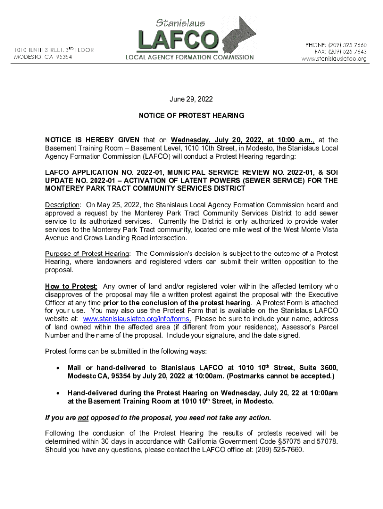 June 29, 2022 NOTICE OF PROTEST HEARING NOTICE IS HEREBY GIVEN that on Wednesday, July 20, 2022, at 10:00 a.m., at the Basement Training Room Basement Level, 1010 10th Street, in Modesto, the Stanislaus