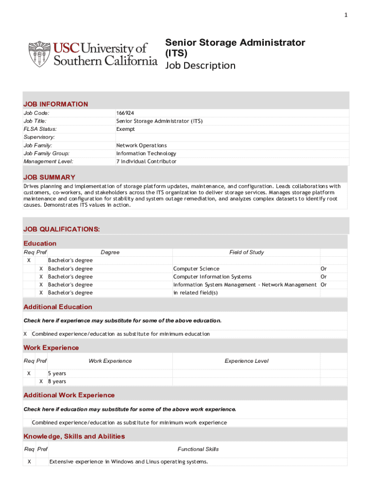 Job Code:166924Job Title:Senior Storage Administrator (ITS)FLEA Status:ExemptSupervisory:
