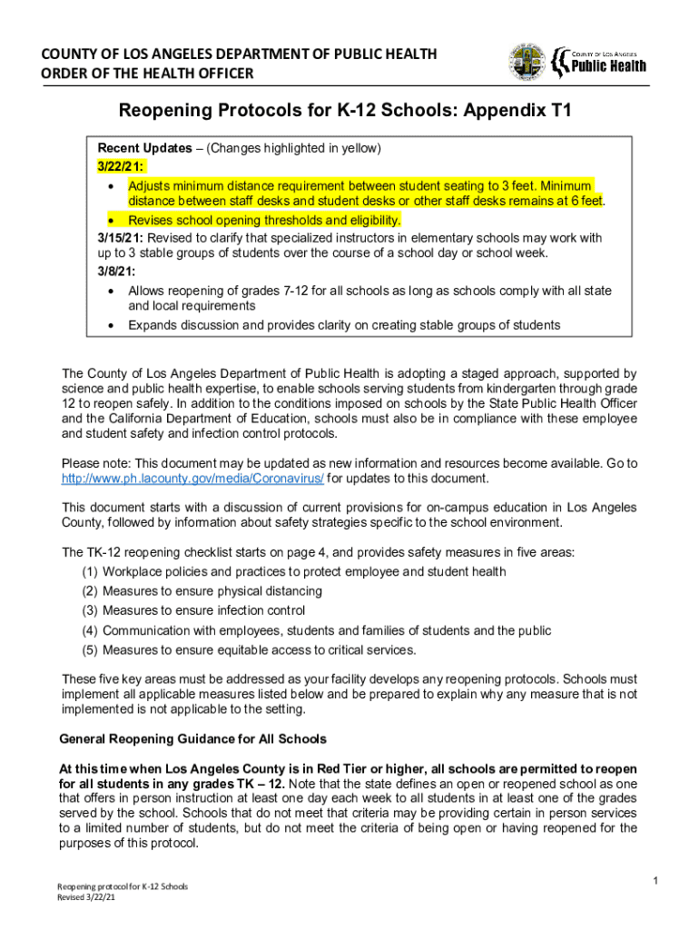 COUNTY OF LOS ANGELES DEPARTMENT OF PUBLIC HEALTH ORDER OF THE HEALTH OFFICERReopening Protocols for K12 Schools: Appendix T1 Recent Updates (Changes highlighted in yellow) 3/22/21: Adjusts minimum