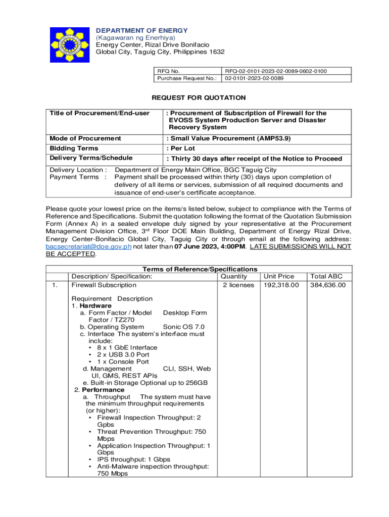 DEPARTMENT OF ENERGY (Kagawaran ng Enerhiya) Energy Center, Rizal Drive Bonifacio Global City, Taguig City, Philippines 1632 RFQ No. Purchase Request No.:RFQ020101202302008906020100 0201012023020089REQUEST