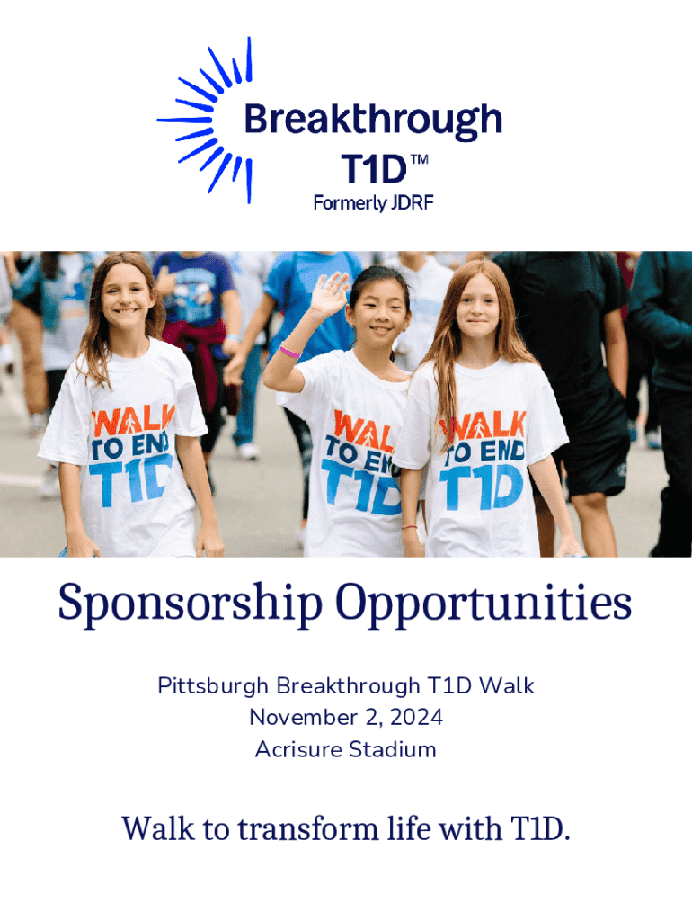 Sponsorship Opportunities Pittsburgh Breakthrough T1D Walk November 2, 2024 Acrisure StadiumWalk to transform life with T1D.About Breakthrough T1D As the leading global type 1 diabetes (T1D) research
