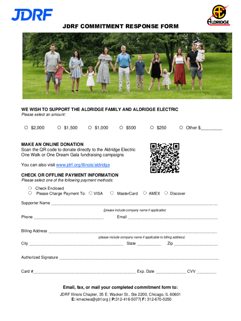 JDRF COMMITMENT RESPONSE FORMWE WISH TO SUPPORT THE ALDRIDGE FAMILY AND ALDRIDGE ELECTRIC Please select an amount:o$2,000o$1,500oo$1,000$500oo$250Other $___MAKE AN ONLINE DONATION Scan the QR code