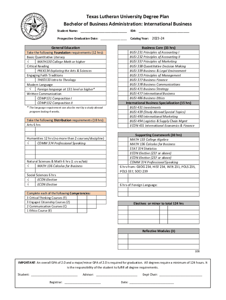 Texas Lutheran University Degree Plan Bachelor of Business Administration: International Business Student Name:___ ID#: ___Prospective Graduation Date: ___General Educational the following Foundation