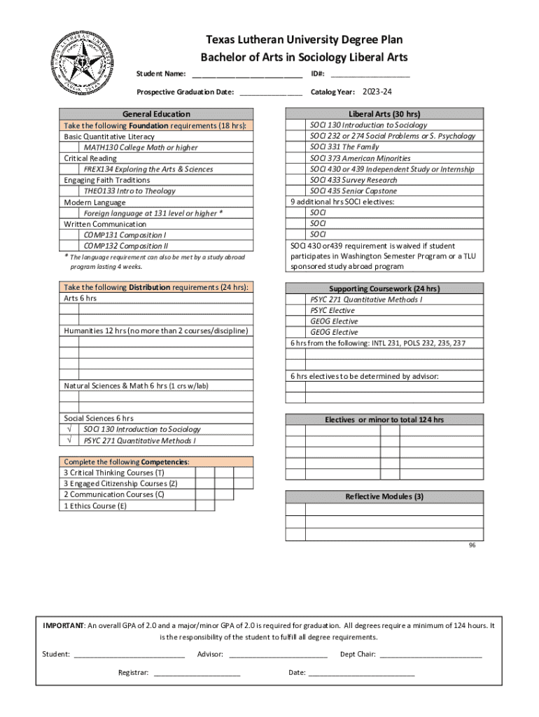 Texas Lutheran University Degree Plan Bachelor of Arts in Sociology Liberal Arts Student Name:___ ID#: ___Prospective Graduation Date: ___General Educational the following Foundation requirements