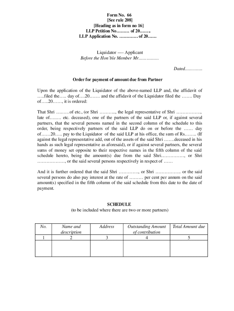 Form No. 66 [See rule 208] [Heading as in form no 16] LLP Petition No of 20. LLP Application No. . Of 20 Liquidators Applicant Before the Hobble Member Mr Dated. Order for payment of amount due from