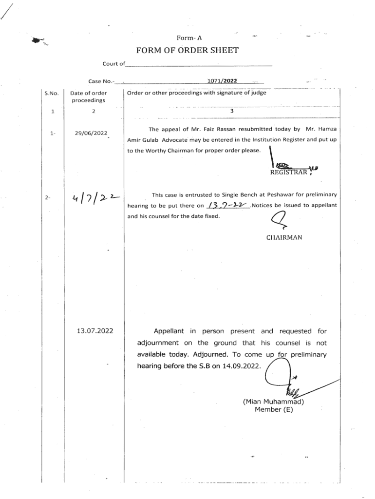 Form Ai.\'like\'FORM OF ORDER SHEET Court of Case No. S. No.11Date of order proceedings1071/2022Order or other proceedings with signature of judge3229/06/2022LThe appeal of Mr. Fair Hassan resubmitted