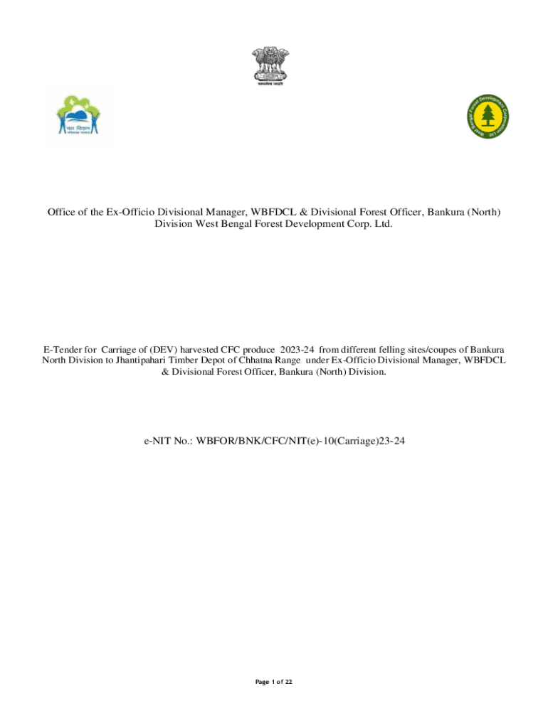 Office of the Ex-officio Divisional Manager, WBF DCL & Divisional Forest Officer, Bandura (North) Division West Bengal Forest Development Corp. Ltd.Tender for Carriage of (DEV) harvested CFC produce