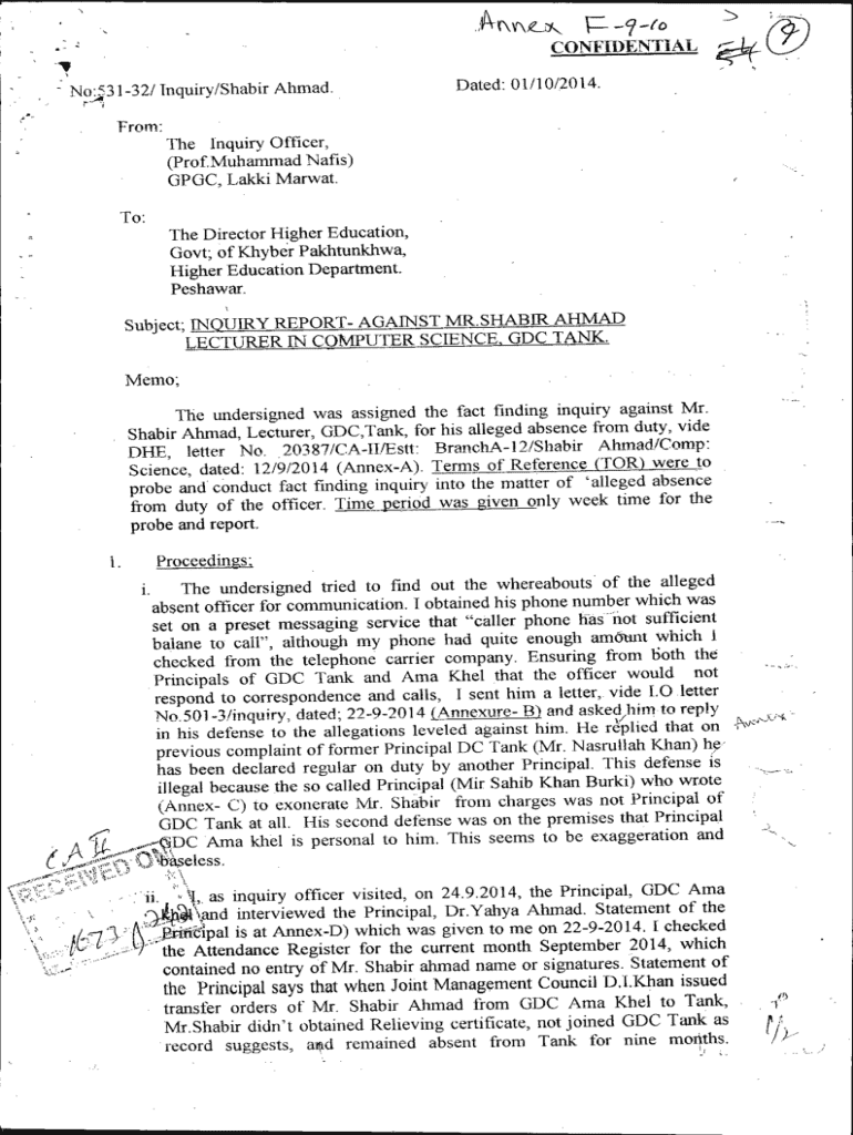 A(V;?_X)v3rONFTDENTIAT\' 7 No;531 32/ Inquiry/Hair Ahmad. Dated; 01/10/2014.from: The Inquiry Officer, (Prof Muhammad Nazis) GPC, Lack Marat. To:The Director Higher Education, Govt; of Khyber Pakhtunkhwa,