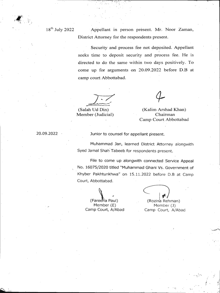 T\', I'm: 18\'^ July 2022Appellant in person present. Mr. Noor Haman, District Attorney for the respondents present. Security and process fee not deposited. Appellant \'i\'seeks time to deposit security