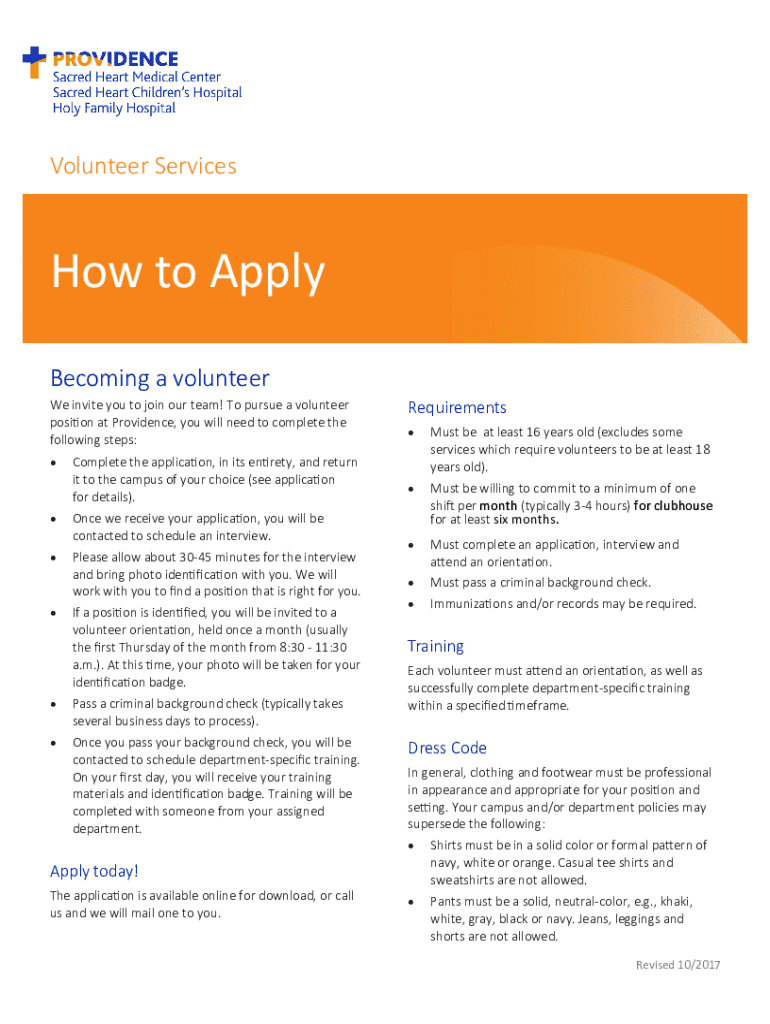 Application form and information for individuals interested in volunteering at Providence healthcare facilities.