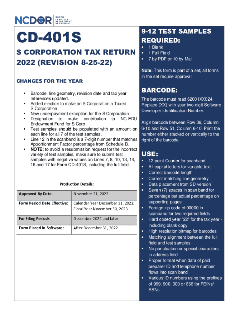 CD401S S CORPORATION TAX RETURN 2022 (REVISION 82522) CHANGES FOR THE YEAR Barcode, line geometry, revision date and tax year references updated. Added election to make an S Corporation a Taxed S