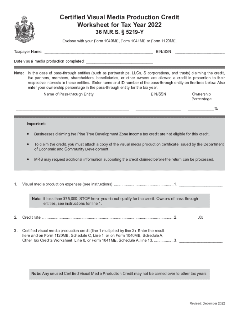 Certified Visual Media Production Credit Worksheet for Tax Year 2022 36 M.R.S. 5219YEnclose with your Form 1040ME, Form 1041ME or Form 1120ME. Taxpayer Name:___ EIN/SSN: ___ Date visual media production