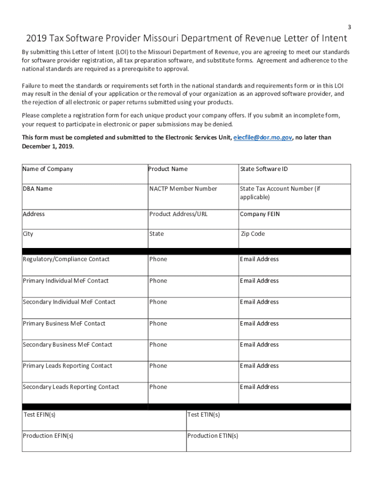Missouri Department Of Revenue Letter of Intent Tax Year 2019 Elecfile@dor.mo.gov LOI Due Date: December 1, 201932019 Tax Software Provider Missouri Department of Revenue Letter of Intent By submitting