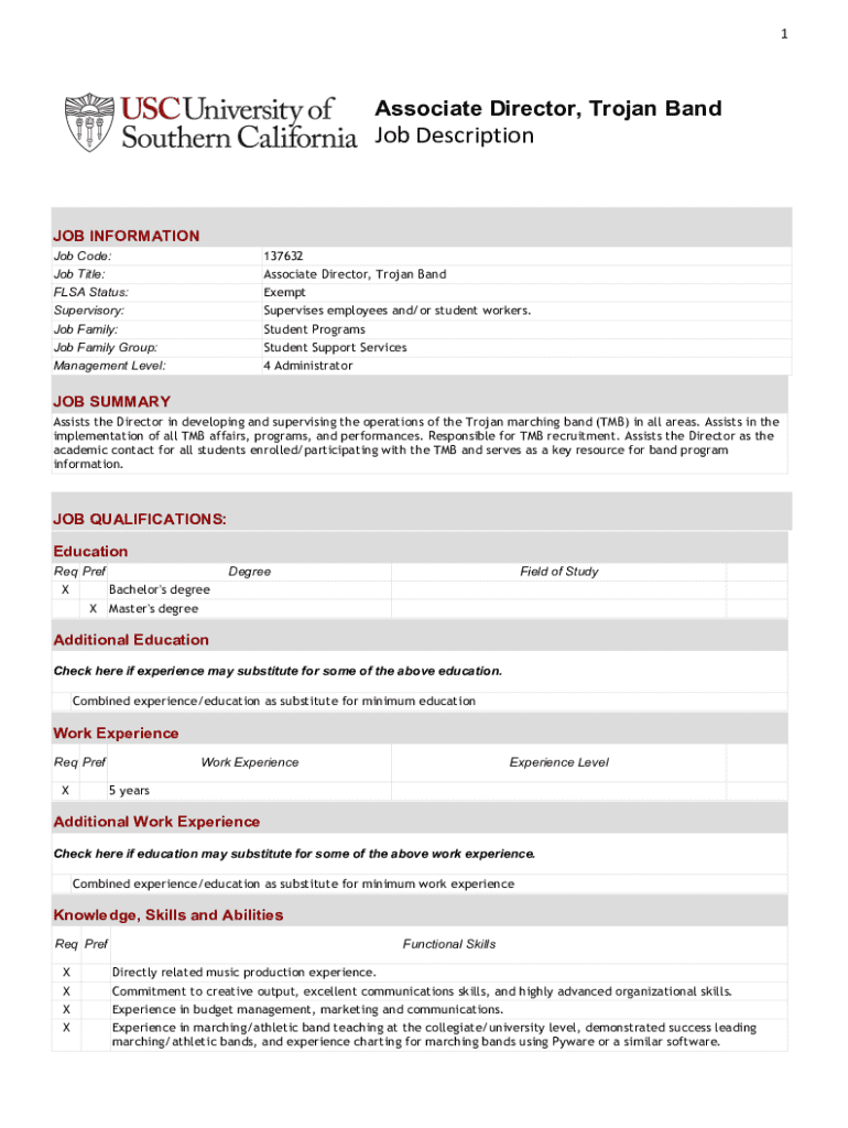 Job Code:137632Job Title:Associate Director, Trojan Bands Status:ExemptSupervisory:Supervises employees and/or student workers. Job Family:Student