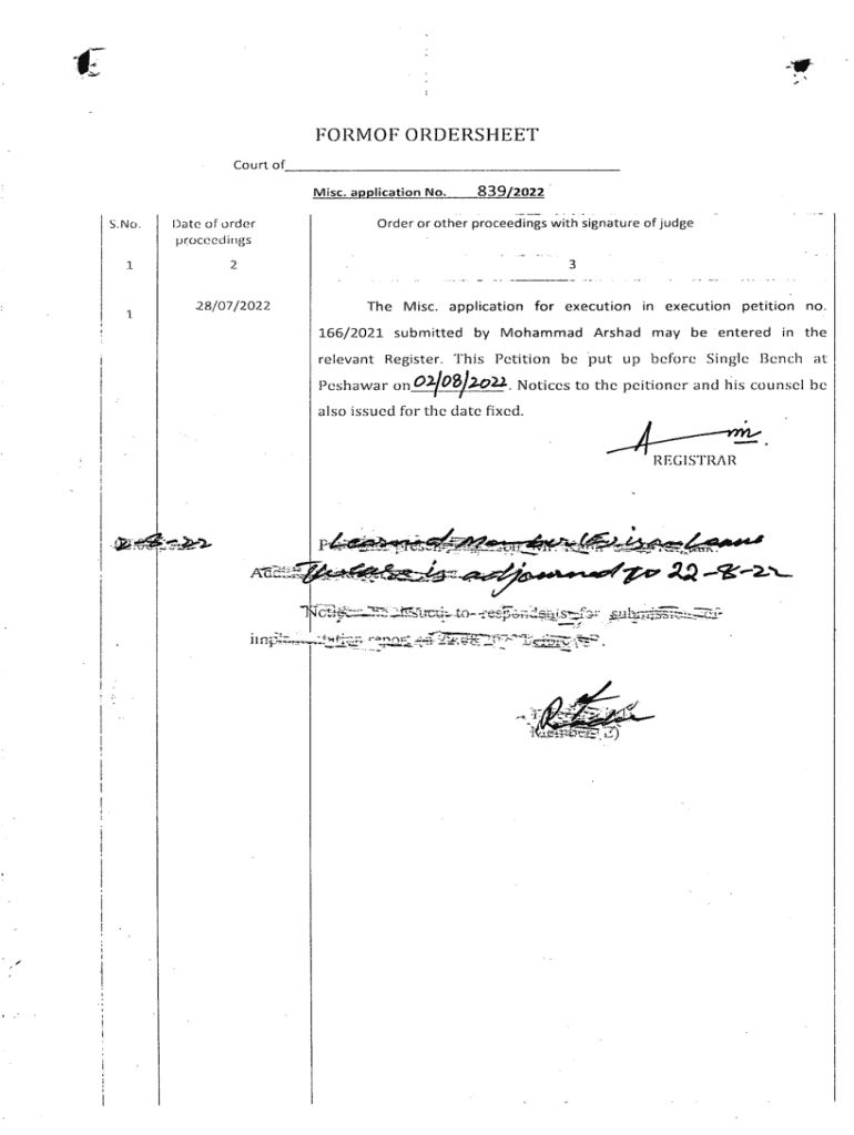 F×.VFORMOFORDERSHEET Court of Misc. Application No. S. No.11.839/2022Order or other proceedings with signature of judged of order proceedings32 .28/07/2022The Misc. Application for execution in execution