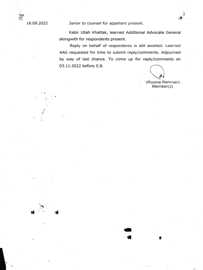 1 16.09.2022Junior to counsel for appellant present. Air Ullah Kathak, learned Additional Advocate General along with for respondents present. Reply on behalf of respondents is still awaited. Learned