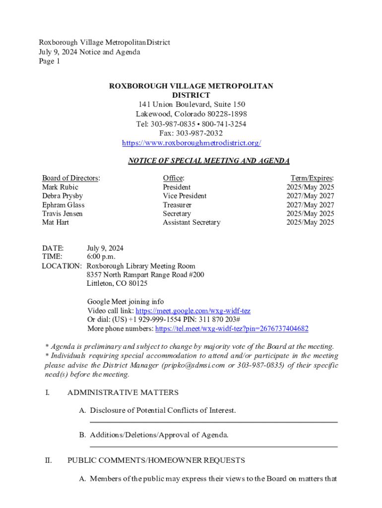 Get the free Notice and Agenda Roxborough Village Metropolitan District