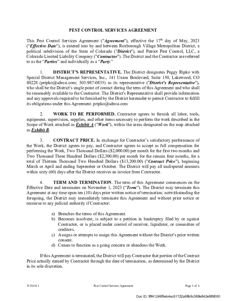 PEST CONTROL SERVICES AGREEMENT This Pest Control Services Agreement (\”Agreement\”), effective the 17th day of May 2023 (Effective Date), is entered into by and between Foxborough Village Metropolitan