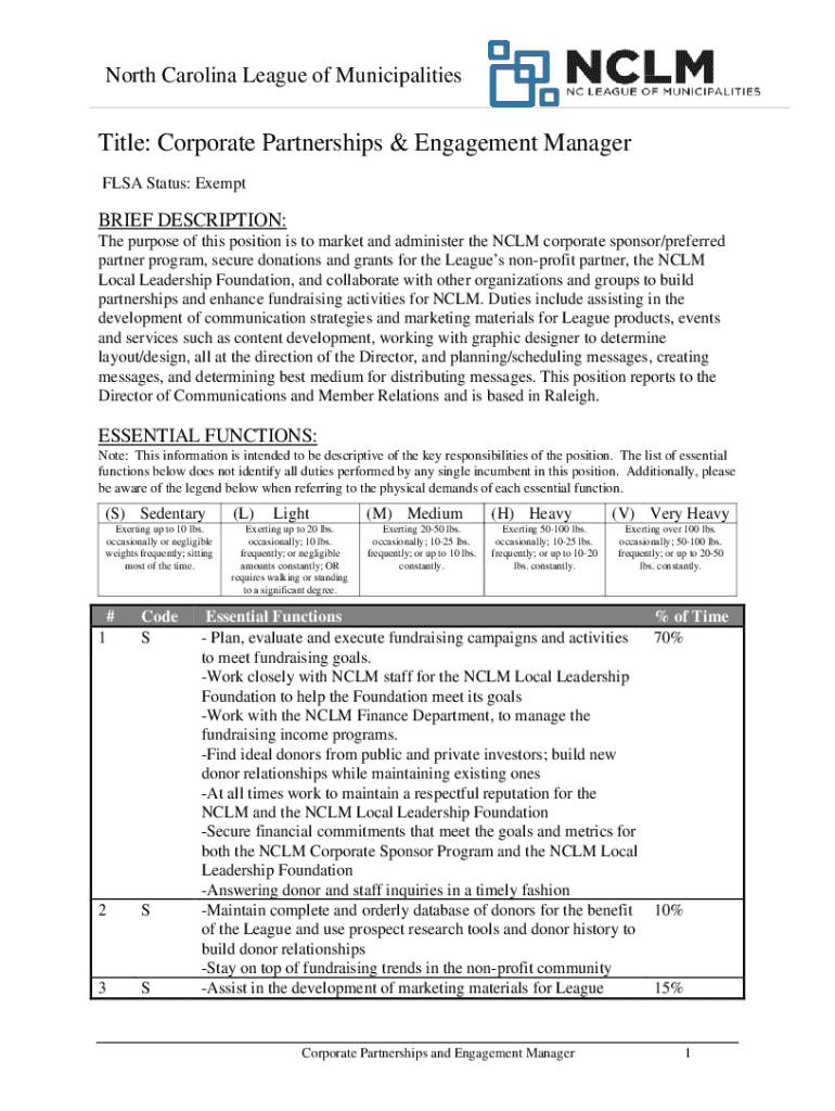 North Carolina League of MunicipalitiesTitle: Corporate Partnerships & Engagement Manager FLSA Status: ExemptBRIEF DESCRIPTION: The purpose of this position is to market and administer the NCLM corporate