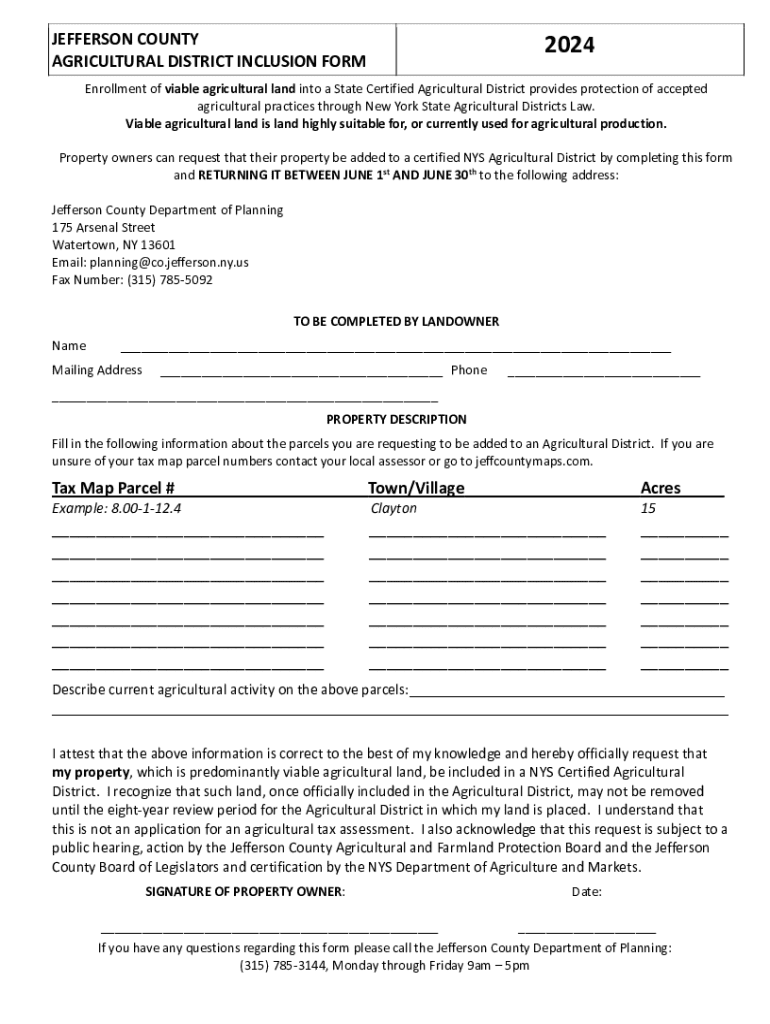 2024JEFFERSON COUNTY AGRICULTURAL DISTRICT INCLUSION FORMEnrollment of viable agricultural land into a State Certified Agricultural District provides protection of accepted agricultural practices